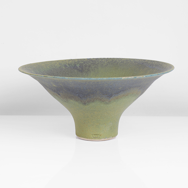 Initially he chose painting as his medium of choice but soon found clay could help him produce forms that reminded him of his childhood and native country, Yemen. Experimenting with colour and texture, his work evolved quickly gaining attention from ceramic enthusiasts including Cyril Frankel and David Attenborough. Today he has an international following and pieces by him are always well received when they come to the open market. His works are typically restrained and elegant forms, with glazes ranging from soft grey to vibrant turquoise and often with bronze manganese around the rims.